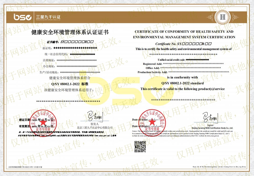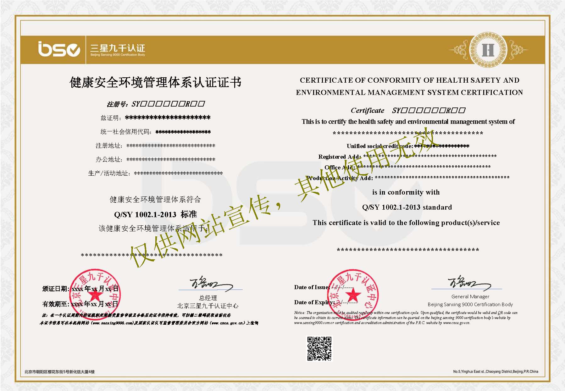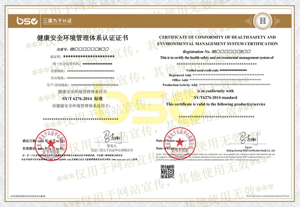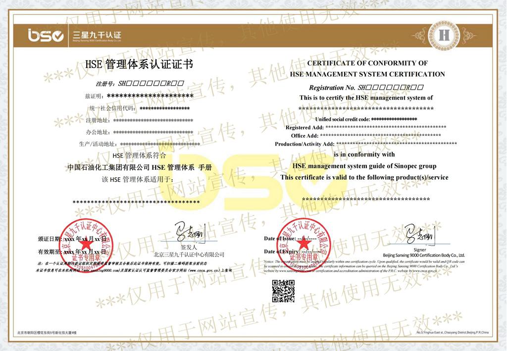 石油化工行業(yè)HSE管理體系認(rèn)證證書樣本