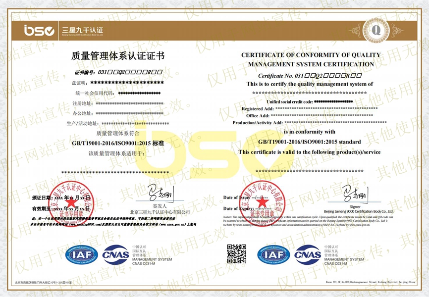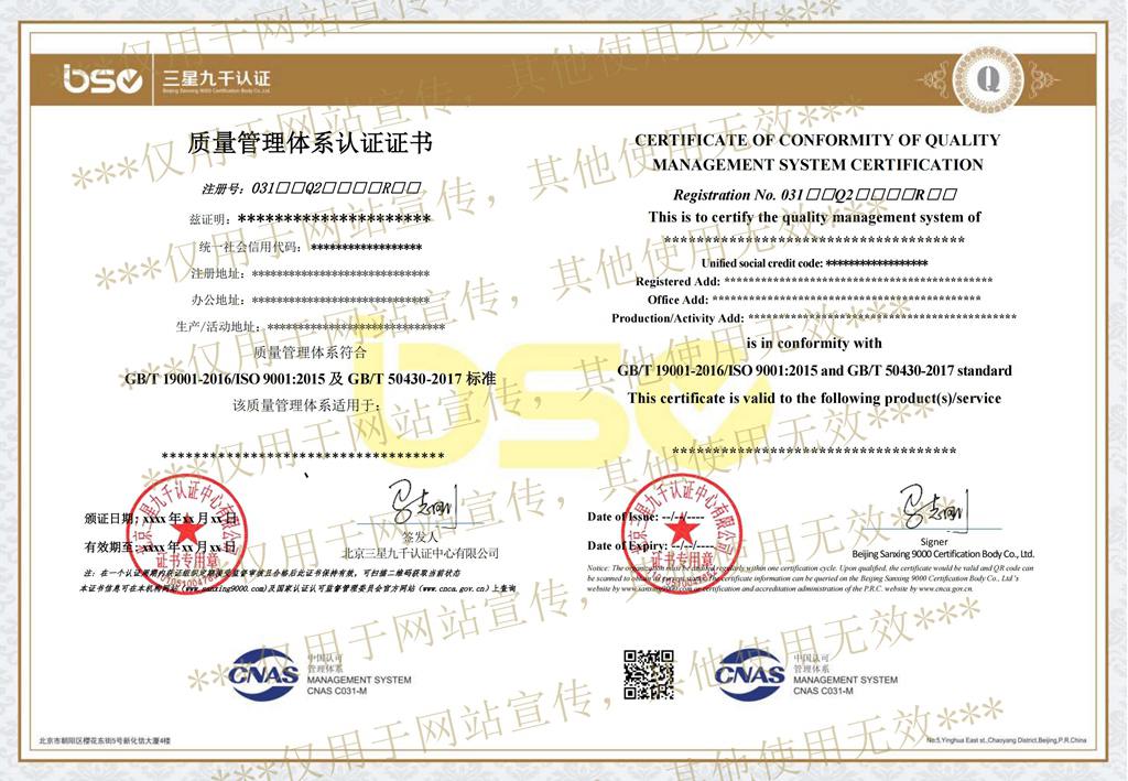 質(zhì)量(建工)管理體系認(rèn)證證書樣本