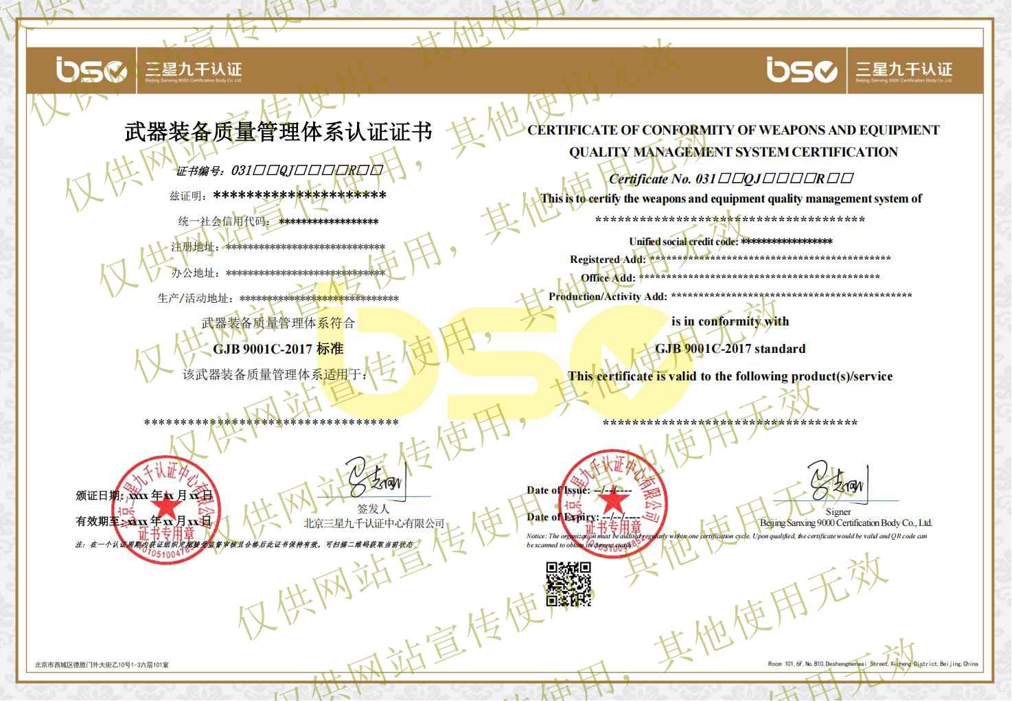 武器裝備質(zhì)量管理體系認(rèn)證證書樣本