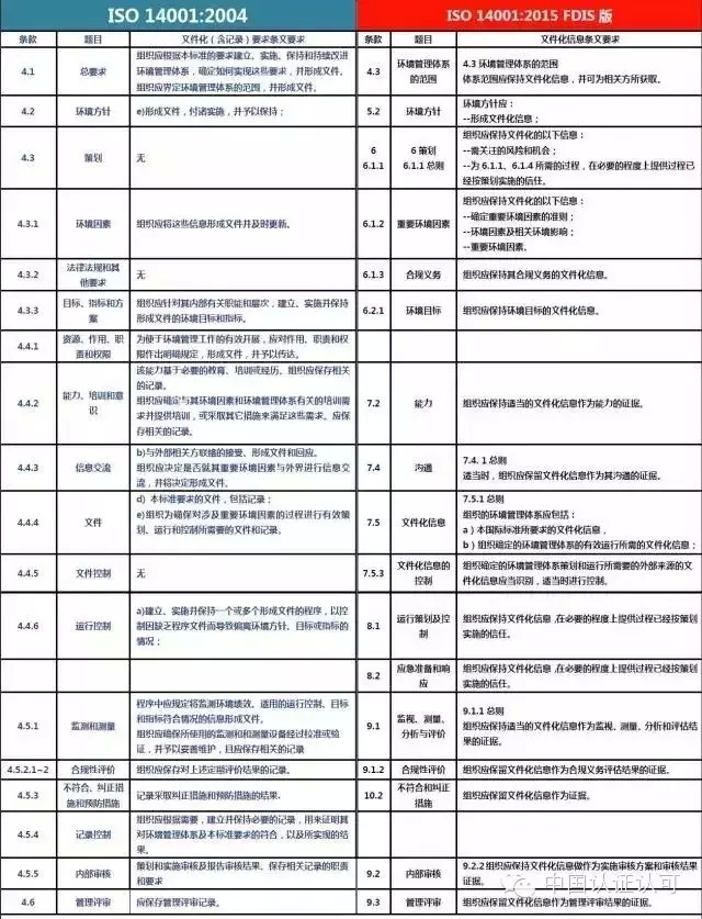 另外,術語部分原DIS版標準中的3.30程序的已被刪去,FDIS版只保留了3.3.5過程,故新建立環(huán)境管理體系的組織還是可以參考舊版標準建立管理體系文件的通行做法,但這并不是即將在2015年9月發(fā)布的IS版所倡導的思想理念。組織按新版建立體系時,可以沒有手冊和任何的程序文件,例如:用一張圖表或文件清單列出整個管理體系的文件,不一定要有一致的文件層次名稱格式,只要文件的具體內(nèi)容能滿足標準所有條款的要求,這樣的文件化環(huán)境管理體系是完全能符合新版標準要求的。