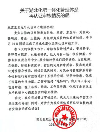 10月8日,公司收到湖北化肥分公司發(fā)來感謝信,對三星九千審核組表現(xiàn)出的專業(yè)、敬業(yè)精神表示衷心感謝?蛻舻恼J(rèn)可是三星九千前進的動力。今后三星九千將會一如既往,為湖北化肥做好QESEn管理體系建設(shè)的服務(wù)工作,為湖北化肥對標(biāo)一流化工企業(yè)管理提升貢獻力量。