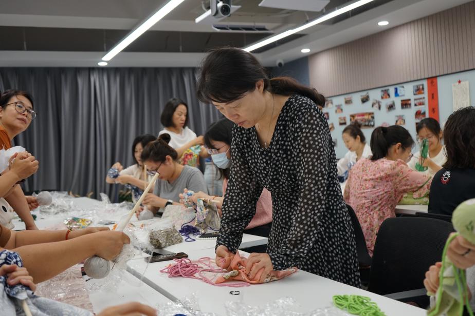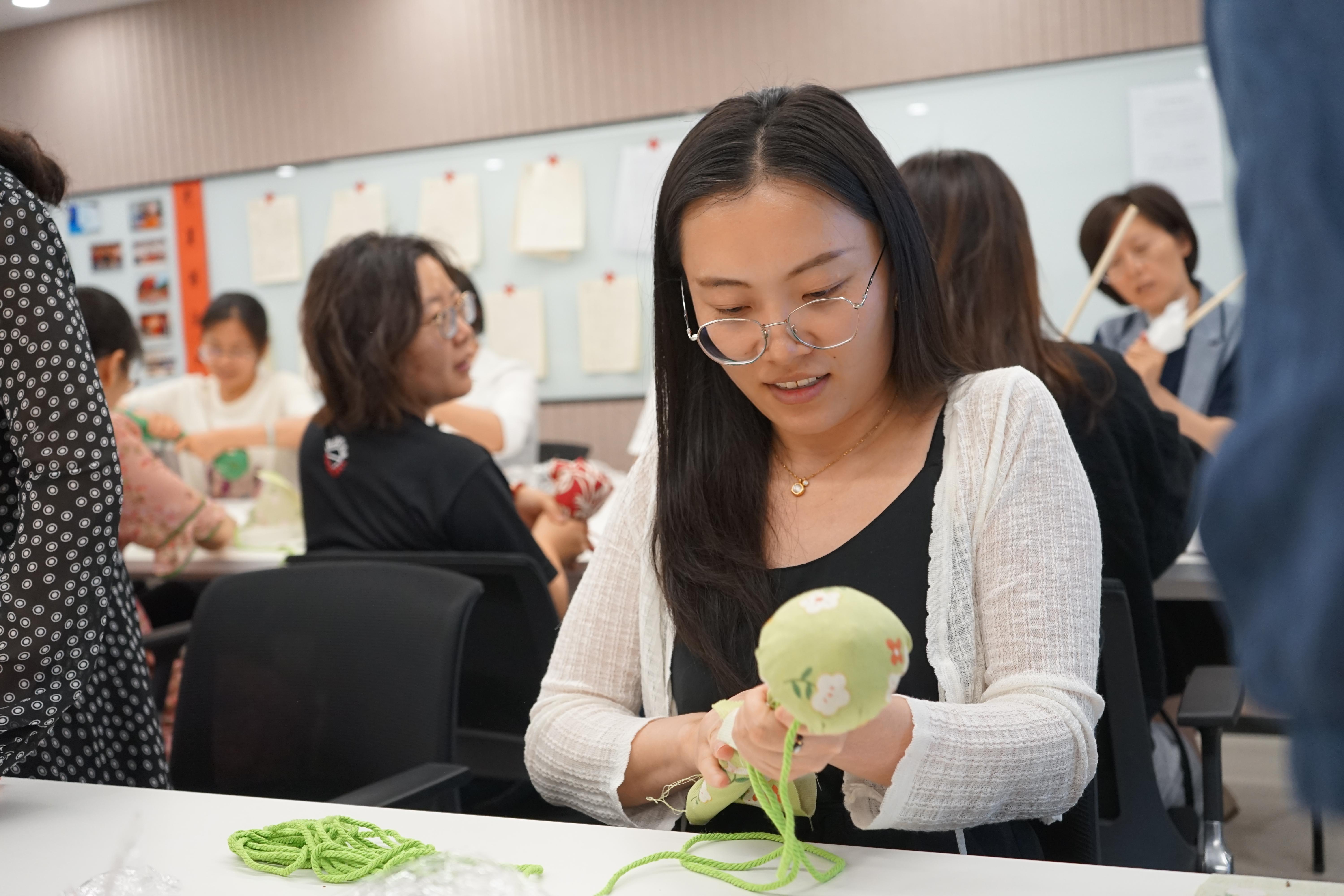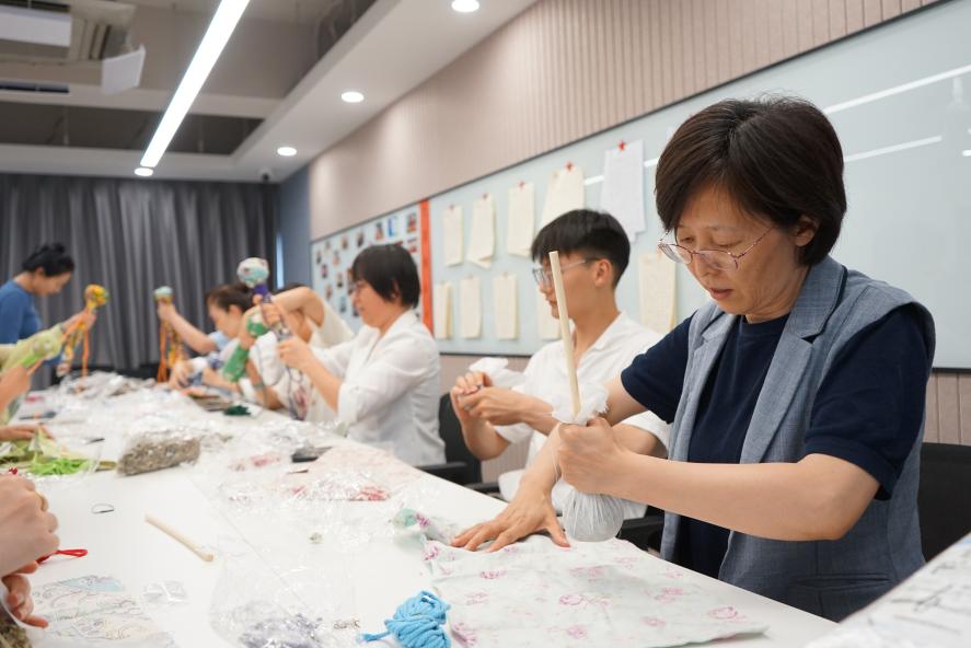 活動伊始,活動組織者首先向大家介紹了端午節(jié)掛艾草的民俗背景及艾草藥用價值和中醫(yī)養(yǎng)生知識,讓大家對艾草有了更深入的了解;進入手工DIY環(huán)節(jié),向大家現(xiàn)場演示了艾草錘的制作方法和使用方法。隨后,員工們紛紛動手嘗試,按順序鋪平布料、將曬干的艾草放在中間,用布料裹住,捏成一個緊實的圓形,插入木棍,拿出繩子將剩余的布料緊緊捆綁成柱形,大家有條不紊,一邊完善手工步驟,一邊互幫互助,一個個精致的艾草錘在大家的手中逐漸成形,隨后大家用做好的艾草錘敲敲肩頸、捶捶后背,拍打之間,經(jīng)絡(luò)暢達、身心舒暢,整個活動現(xiàn)場充滿了歡聲笑語,氣氛熱烈而融洽。