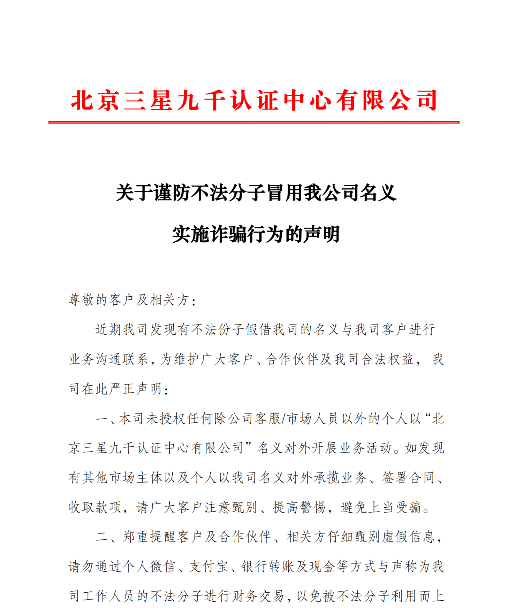 關(guān)于謹(jǐn)防不法分子冒用我公司名義實(shí)施詐騙行為的聲明